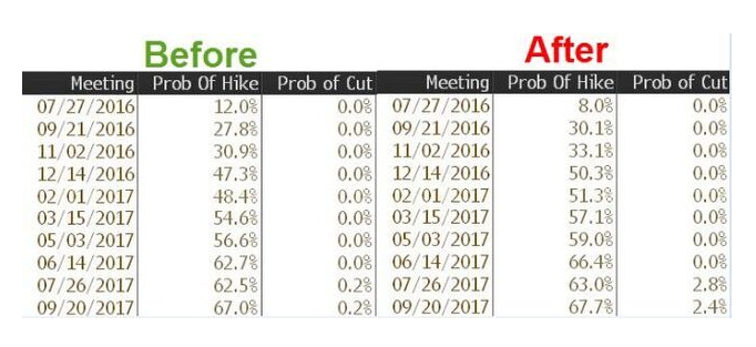 6月会议后一周,英国公投决定退欧。虽然市场出现了短时间剧动,但很快恢复,美股还创下了历史新高。近期零售销售、房屋开工、产能利用率、服务行业等方面的数据都超过了经济学家们的预期。