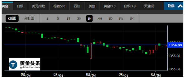 现货黄金周三(8月3日)亚市早盘开于1363.20美元/盎司,最低下探1353.86美元/盎司,最高上涨至1366.45美元/盎司,收于1357.90美元/盎司,下跌5.4美元,跌幅为0.4%。