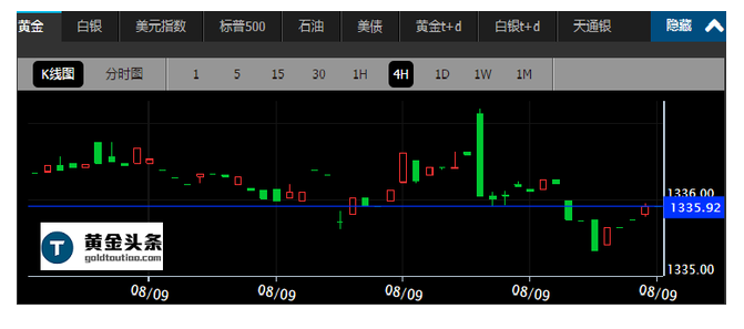 现货黄金周一(8月8日)亚市早盘开于1335.09美元/盎司,最低下探1329.55美元/盎司,最高上涨至1338.24美元/盎司,收于1335.00美元/盎司,上涨0.2美元,涨幅0.01%。