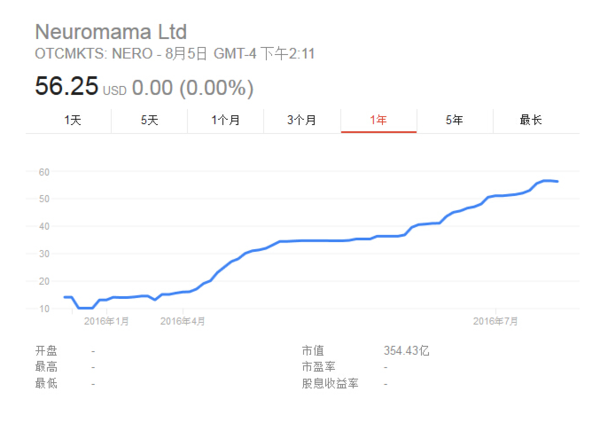 Neuromama目前在美国场外市场(OTC市场)交易,最新交易时间为8月5日,当天报价56.25美元。该股票今年从不足13美元一路上涨,目前已经翻了4倍多。