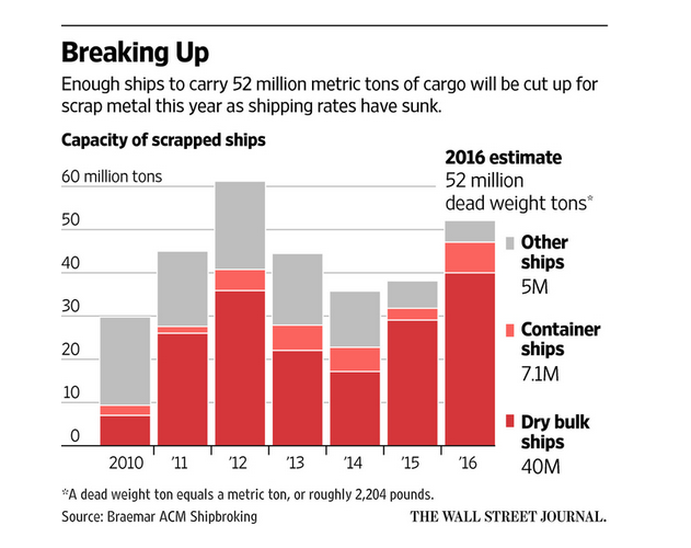 《华尔街日报》根据船运经纪数据报道,今年预计约有1000艘货轮将被拖到海滩切割,当做金属废料出售,这些被“肢解”的货轮合计货运吨位达5200万公吨,有记录以来仅次于2012年的6100万公吨。不仅如此,今年前7个月货轮的生产订单仅293艘,约为2010到2015年年均订单量的五分之一。
