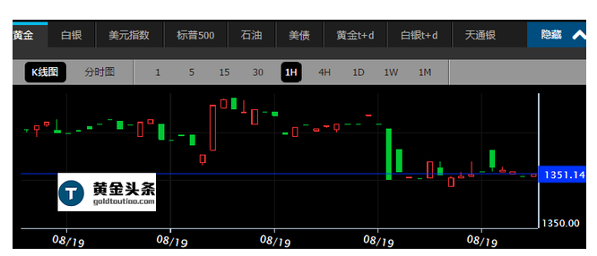 现货黄金周四(8月18日)亚市早盘开于1348.40美元/盎司,最低下探1345.44美元/盎司,最高上涨至1356.20美元/盎司,收于1350.70美元/盎司,上涨2.5美元,涨幅0.19%。