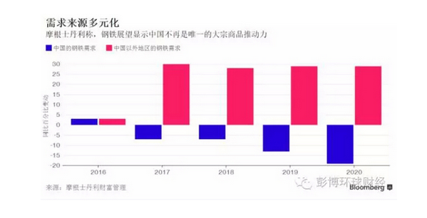 以下来自彭博环球财经的图表展示了摩根史丹利的观点:大宗商品不再只有中国一个主要需求来源。以钢铁为例,除了今年,从2017年到2020年的四年里,预计每年中国以外地区的钢铁需求同比增速都接近30%,中国均为负增长。