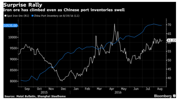 下图来自彭博,白色线条为铁矿石现货价格,蓝色线条为中国港口库存(截止8月19日)。其中,连云港上半年铁矿石吞吐量同比爆发性增长236.7%,几乎占据港口货物的一半。今年上半年,中国铁矿石进口量创下历史最高纪录。