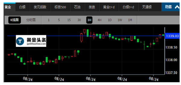现货黄金周二(8月23日)亚市早盘开于1338.27美元/盎司,最低下探1334.90美元/盎司,最高上涨至1344.53美元/盎司,收于1337.00美元/盎司,下跌1.53美元,跌幅0.11%。