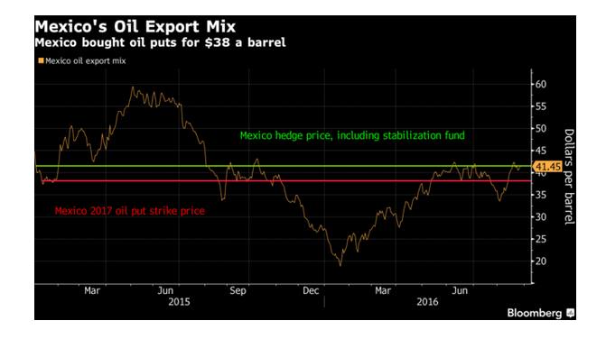墨西哥财政预算收入的三分之一来自于墨西哥国家石油公司(Pemex)上缴的税收。该国政府每年从华尔街银行处购买期权合约来对冲原油价格的下跌。