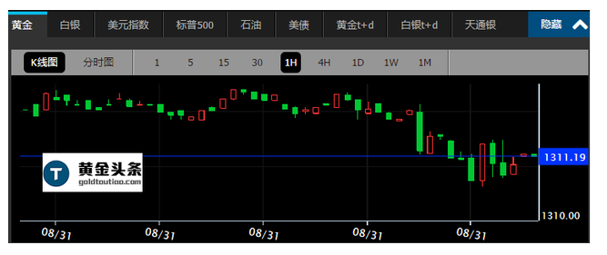 现货黄金周二(8月30日)亚市早盘开于1322.70美元/盎司,最低下探1308.65美元/盎司,最高上涨至1325.20美元/盎司,收于1310.70美元/盎司,下跌12.65美元,跌幅0.96%。