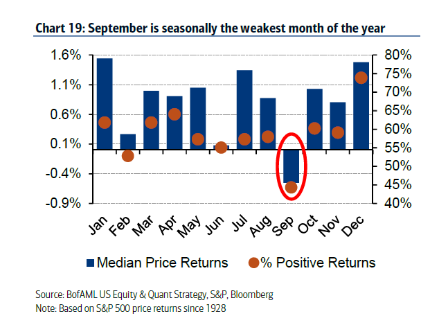 需要提醒的是,9月并不是什么丰收的时节,按照美银美林美股与量化策略团队负责人Savita Subramanian的统计,自1928年以来,标普500指数在9月的回报率中值为负,是12个月当中唯一一个负收益率的月份。所以美股投资者请系好安全带。