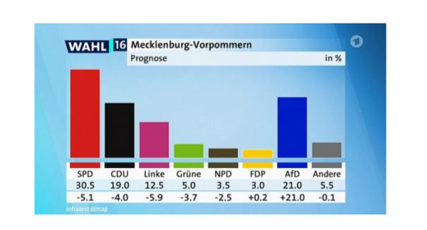 据德国之声报道,德国总理默克尔所领导的基督教民主联盟(CDU)在德国东北部联邦州梅克伦堡-前波莫瑞州(Mecklenburg-Vorpommern,简称梅前州)所举行的地方选举中受到挫败,仅获得19%的选票,列第三位,这是该州历史上最差的成绩。