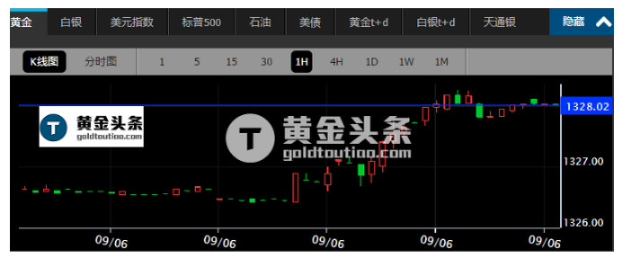 现货黄金周一(9月5日)亚市早盘开于1323.67美元/盎司,最低下探1322.40美元/盎司,最高上涨至1328.57美元/盎司,收于1326.33美元/盎司,上涨2.03美元,涨幅0.15%。