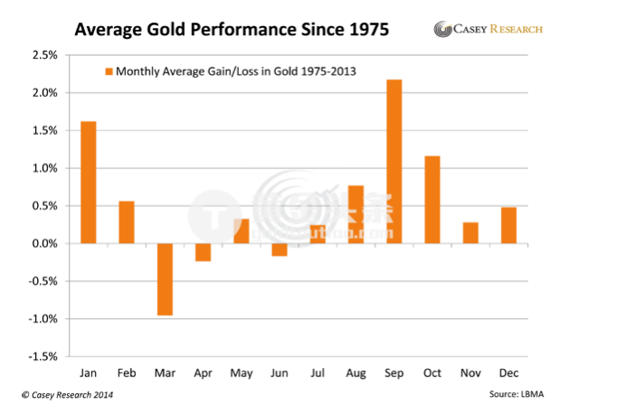 比较1975-2013年,这38年间的历史数据发现,8月至次年2月通常是金价的上涨阶段,随后3月至7月,金价则处于盘整阶段。其中,9月是金价表现最佳的月份,平均涨幅为2%。
