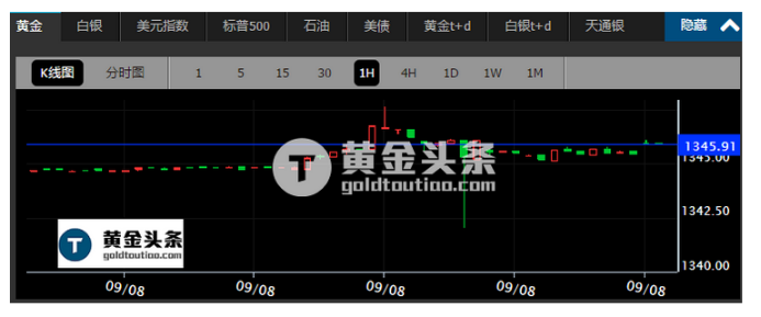 现货黄金周三(9月7日)亚市早盘开于1347.80美元/盎司,最低下探1342.56美元/盎司,最高上涨至1352.65美元/盎司,收于1344.88美元/盎司,下跌4.68,跌幅0.35%。