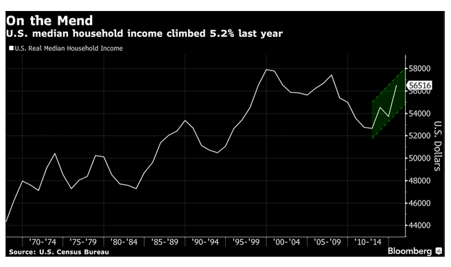 经过多年停滞后,2015年美国家庭收入录得了2007年金融危机以来的首次增长,显示了美国经济健康发展,普通民众从经济复苏中获益,这也可能会助民主党候选人在大选中一臂之力。