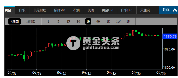 现货黄金周四(9月22日)亚市早盘开于1336.45美元/盎司,最低下探1331.01美元/盎司,最高上涨至1343.55美元/盎司,收于1336.40美元/盎司,上涨1.9美元,涨幅0.14%。