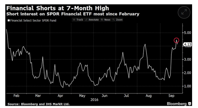 据彭博和IHS Markit Ltd数据,金融板块SPDR ETF的做空指标(short interest: 当前卖空的股数/已发行股数)已创7个月来新高,飙至4.5%,下图来自彭博。