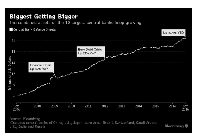据彭博统计,全球最大的10家央行资产规模如今已经达到21.4万亿美元,这相当于全球经济体量的三成,且较2008年9月中旬规模量足足翻了一倍。