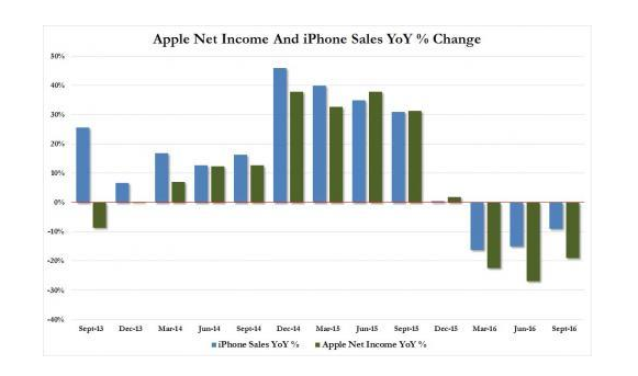 今年以来,苹果已经连续三季度营收缩减。2016财年,苹果公司收入为2156亿美元,为2001年以来首次同比下滑。大中华区第四财季销售额更是较去年同期大跌30%。苹果股价盘后下跌2.8%。