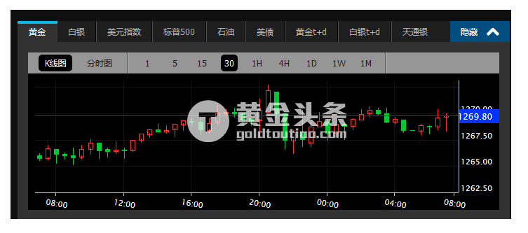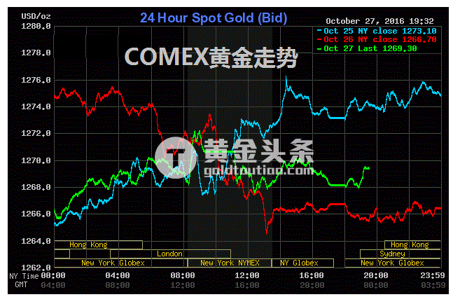 现货黄金周四(10月27日)亚市早盘开于1266.61美元/盎司后小幅下挫,录得日内低点1264.90美元/盎司后转小幅震荡上行。美市金价大幅震荡,短线跳涨录得日内高点1272.67美元/盎司后,冲高回落,最终收于1267.60美元/盎司,下跌0.09%。