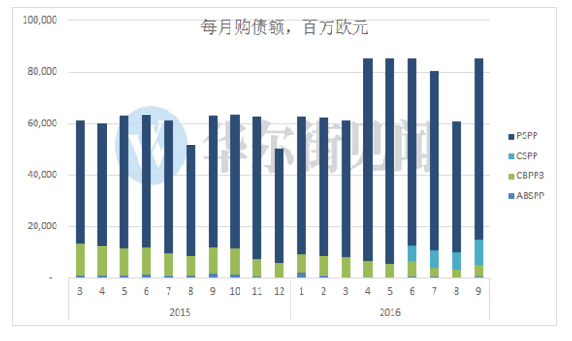根据欧央行的计划,自2015年起,在之前已有的每月100亿ABSPP+CBPP的基础上,外加购买500亿PSPP,以帮助达到通胀目标(接近但略低于2%),而事实是,欧元区通胀一直没有达到目标,甚至一度接近于0%,因此,2016年3月起,欧央行决定加大宽松力度,将购债规模扩大到每月800亿欧元,并且在6月份开始购买CSPP。欧央行并没有规定每月CSPP的数额,从6-9月的结果来看,平均每月购买了74亿欧元,前三个月都是60多亿欧元,9月购买了近100亿欧元。
