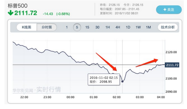 周二(11月1日)美股下跌,标普500指数创近四个月收盘新低,因“电邮门”引发的美国大选不确定性使得市场焦虑情绪上升。本周稍晚将公布FOMC 11月利率决议。