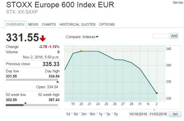 在全球股市抛售大潮中,欧洲股市连续8天下跌。对经济复苏的怀疑和担心美联储加息本就让全球市场情绪紧张,而希拉里和特朗普胶着的选情进一步增加了紧张氛围。