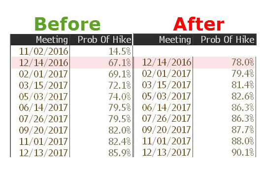 本月美联储货币政策决议大幅增加了市场对于12月会议上加息的预期。下图为本月会议前后市场对未来美联储历次会议决定加息的预测概率,今年12月会议加息的概率已经逼近80%。