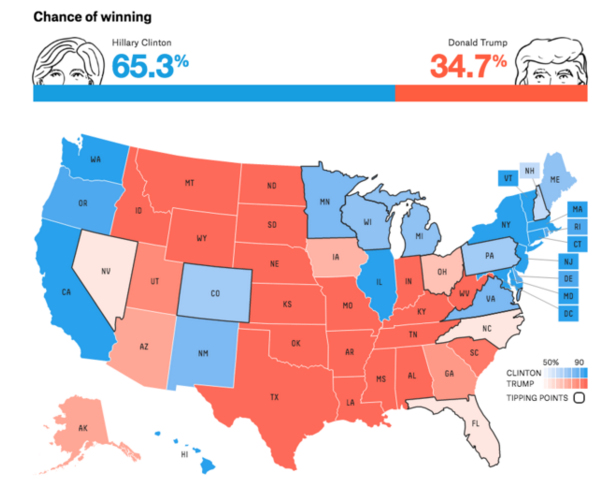 而在两周前,James Comey通知国会,FBI正在审查与之前调查希拉里相关的新一批电子邮件,此举引发市场极大担忧,希拉里的胜选概率也受到拖累,上周结束时跌破70%。