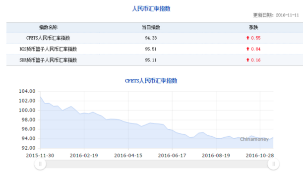 而CFETS人民币一篮子汇率指数上周则呈现上涨态势。据国家外汇交易中心数据,截至11月11日,CFETS人民币汇率指数为94.33,按周涨0.55。