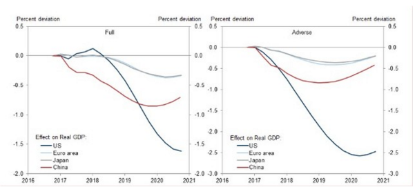 下图显示,“全面”实施特朗普政策将在2017年下半年和2018年上半年推动美国经济增长,但随着不利政策开始占据主导地位,之后将对美国经济增长造成阻力。这种情况下,一开始对欧元区和日本的溢出效应可以忽略不计,但这种效应随后会转为负面,对中国经济则会产生持续的负面影响。“不利”情景则会对全球经济都产生负面的溢出效应。