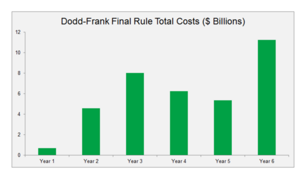 据非盈利智库美国行动论坛的统计,法案已经造成了360亿美元的直接成本(相当于每个美国家庭承担310美元)和7300万小时的监管文件处理时间(相当于每年37000名全职雇员的工作时间)