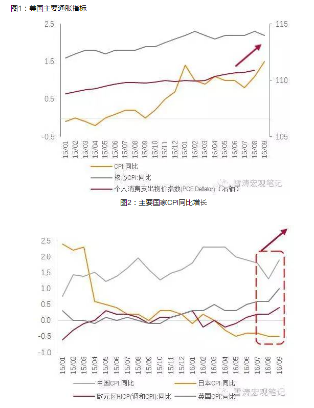 2016年4月以来,欧洲、美国、英国、日本的通胀水平(CPI)持续增长,欧元区10月CPI创下两年新高,美国9月CPI创2014年10月来最高。中国10月CPI同比增长2.1%,较上月上涨0.2个百分点也达到了今年的高位。通胀中枢上行初见端倪。
