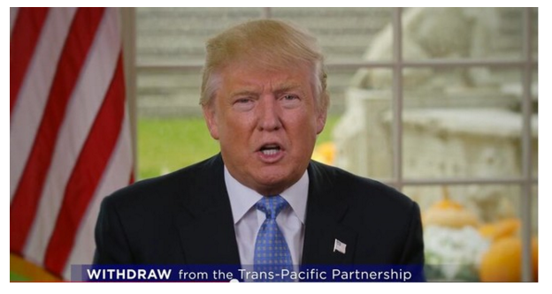 据央视新闻,当地时间21日,美国当选总统特朗普通过视频阐述了他明年1月20日上任后100天执政计划,他在视频中表示,将会在上任的第一天,发布总统行政令,退出《跨太平洋伙伴关系协定》(TPP) 。